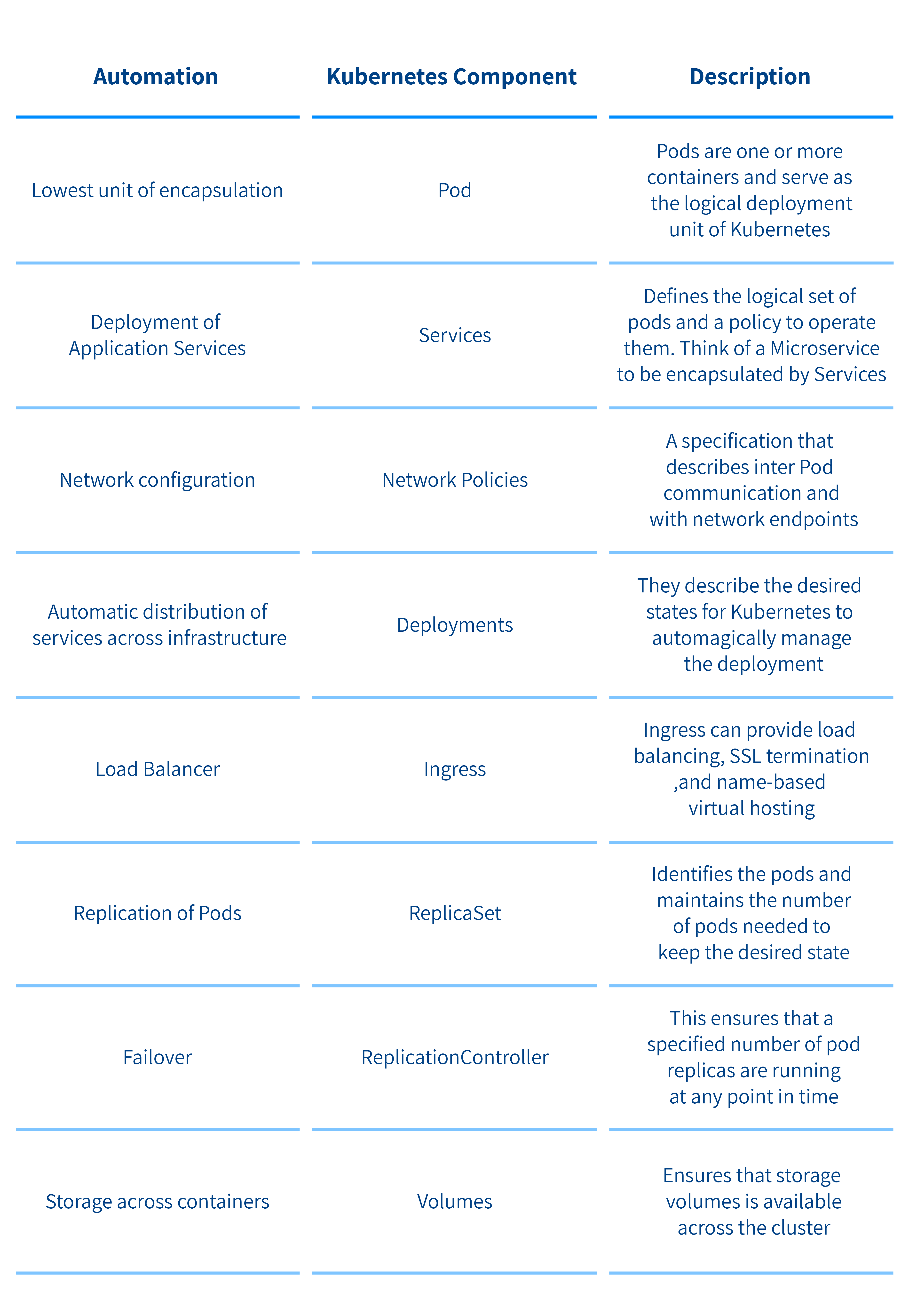 Kubernetes自动化构建异构环境的复杂性和工作负载提供一种标准化的方式来封装到多个云提供商和本地基础设施。使用声明性方法,Kubernetes的疼痛,配置合适的自动化,以满足负载的需求。相反,它提供了必要的钩子,让应用程序部署在混合和多重云环境中无缝。下面的表说明了各种钩子Kubernetes提供必要的自动化的无缝应用程序部署在异构环境中。