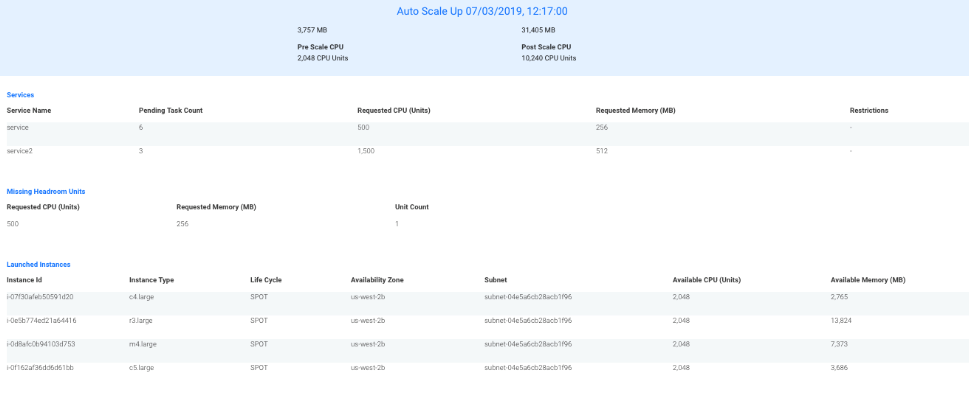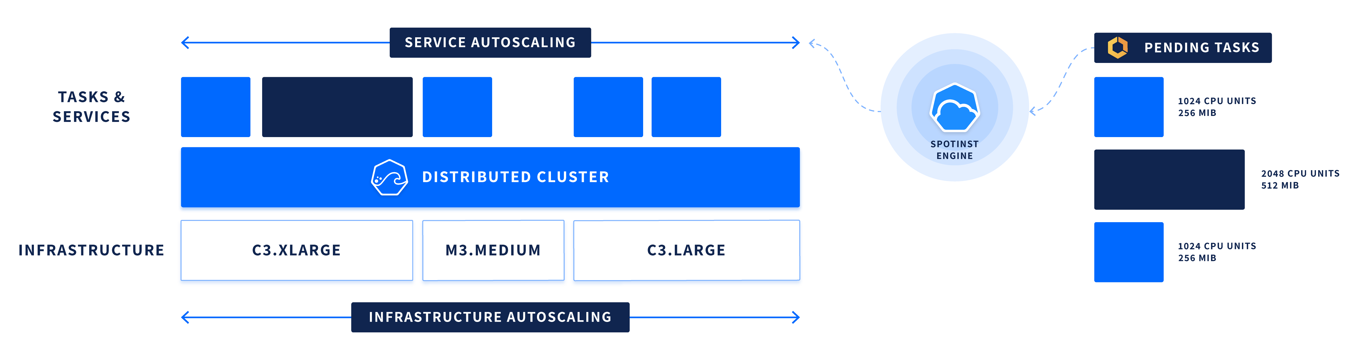作为服务和任务部署,Spotinst海洋利用Spotinst自动定量集群规模,满足应用需求在常规和峰值流量。的自动定量考虑每个任务的资源需求,标签,和约束,以及定价和可用性数据匹配最优机器类型为每个工作负载类型。