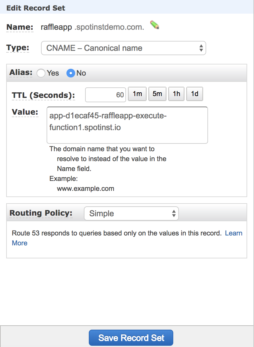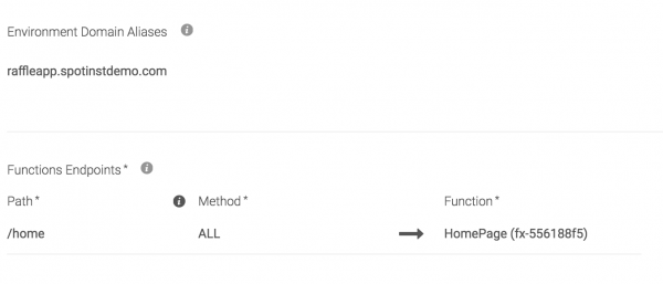 然后你必须设置IP路径在您的环境的功能,又在Spotinst控制台。在同样的标记,编辑函数的端点通过添加路径。只是一个字符串,该字符串开头“/”——“/ home”为例。