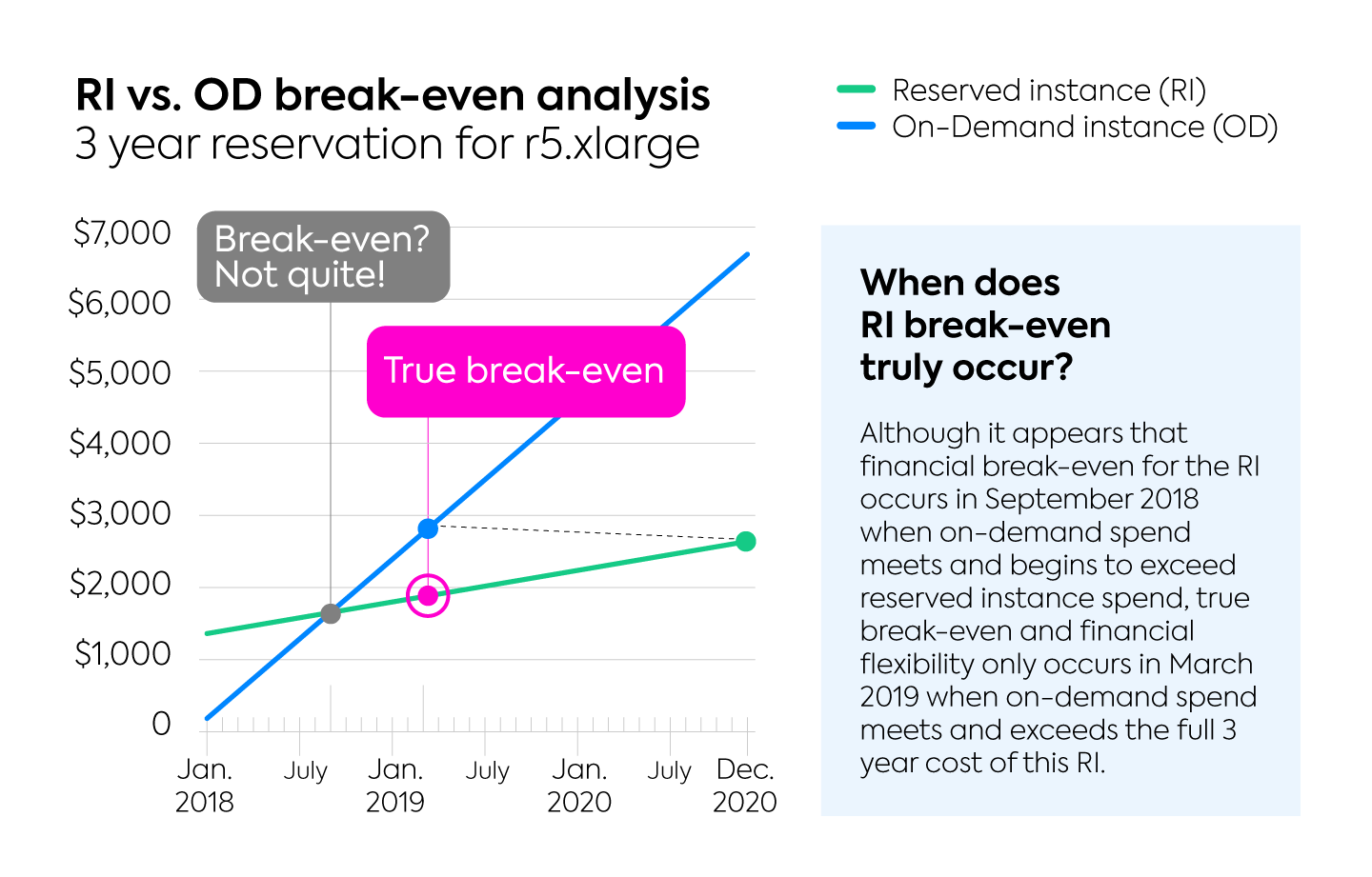 一个晴朗的日子我们的应用工程师告诉你他需要r5.超大实例为他的开发环境。他说明如果你买3.年以上部分前期标准保留来覆盖这些情况60%低于按需速率.当然,他计算出在3年的时间里他需要使用多少实例才能实现收支平衡,以及与按需实例相比,他需要多长时间才能节省60%(见下图)。