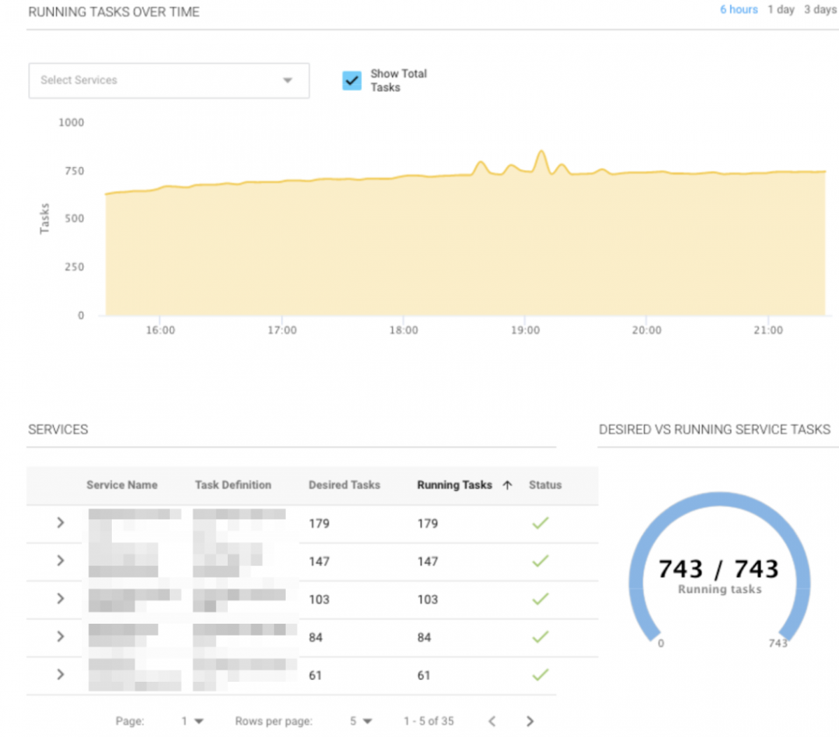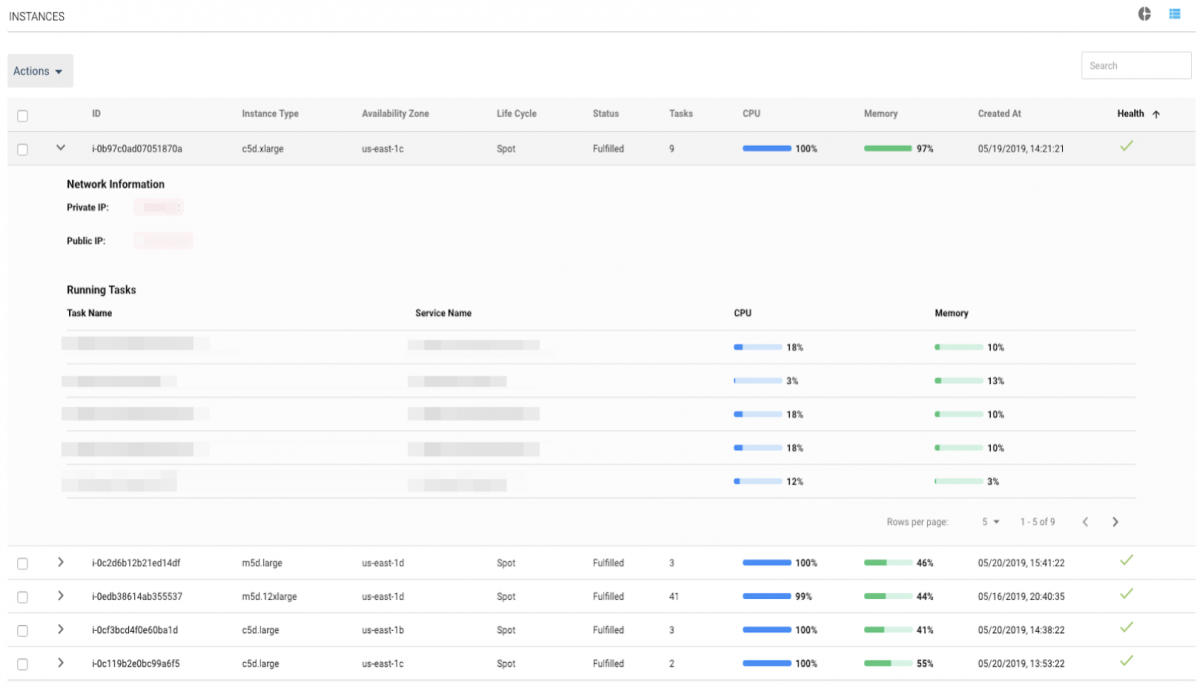 Elastigroup的详细ECS仪表板包含高层集群信息,洞察每个容器实例和服务。