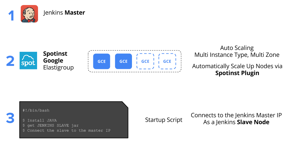 Spotinst詹金斯的插件自动上下尺度实例基于队列的就业人数。节点被配置运行启动脚本和作为奴隶节点连接到主和立即开始运行工作。