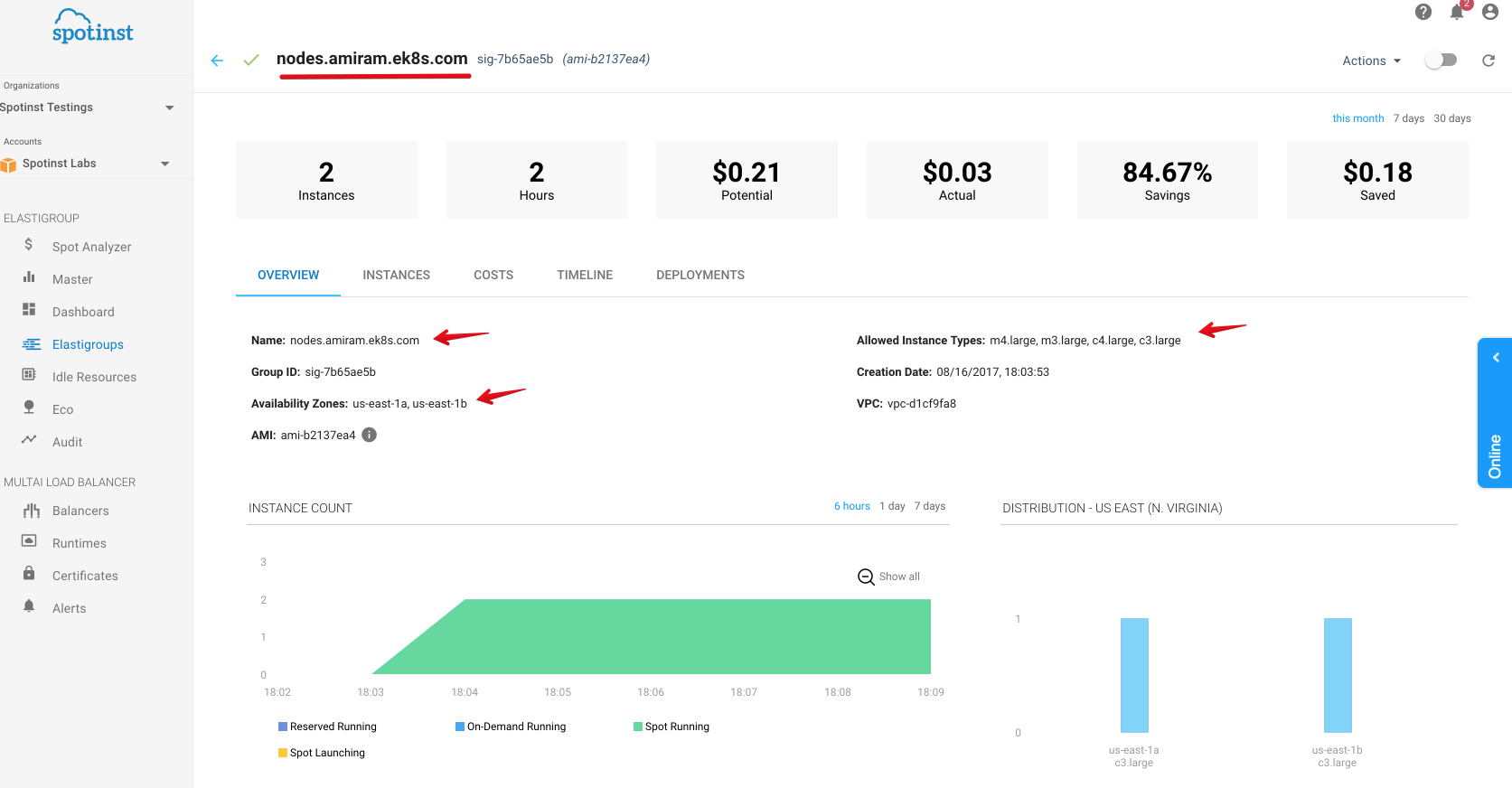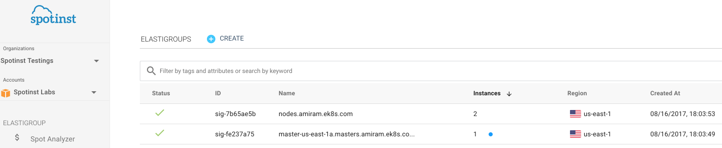 在我们Spotinst控制台:高可用性集群k8启动并运行!并行的,我们可以观察到两个Elastigroups已经创建。一个主人和一个节点: