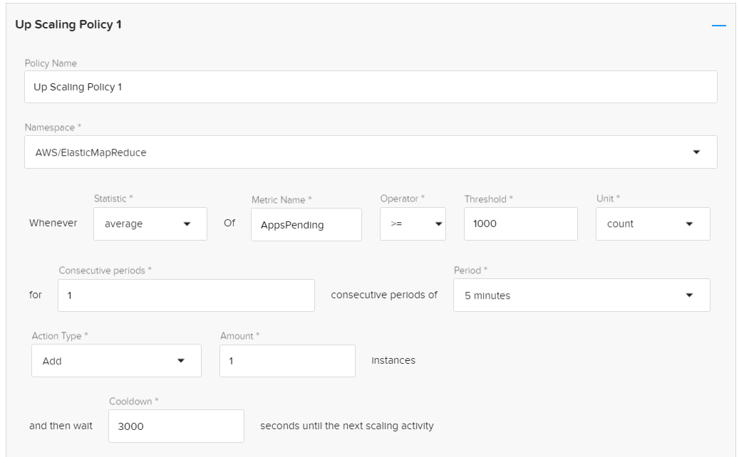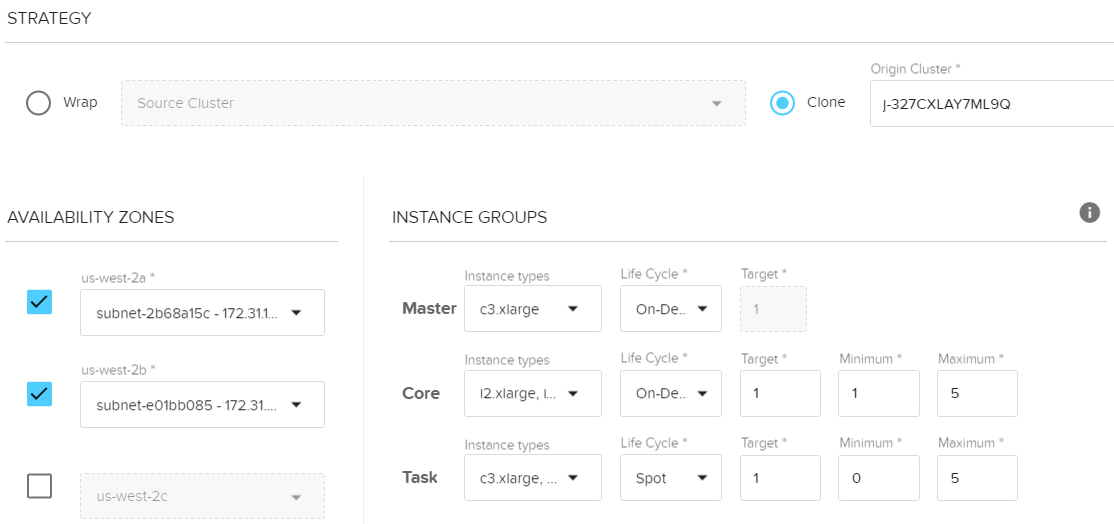 {“mrScaler”:{“名称”:“测试”、“地区”:“us-west-2”、“策略”:{"克隆":{“originClusterId”:“j - 327 cxlay7ml9q}},“计算”:{“availabilityZones”:[{“名称”:“us-west-2a”,“subnetId”:“subnet-2b68a15c”},{“名称”:“us-west-2b”,“subnetId”:“subnet-e01bb085”}],“instanceGroups”: {" masterGroup ":{“目标”:1、“instancetype”: [" c3。超大”),“生命周期”:“ON_DEMAND“}”, coreGroup ": {“instancetype”: [" i2。超大”、“i2.2xlarge”),“生命周期”:“ON_DEMAND”、“能力”:{“目标”:1、“最低”:1、“最大”:5}},“taskGroup ": {“instancetype”: [" c3。超大”、“c4。超大”、“c4.2xlarge”、“c3.2xlarge”),“能力”:{“目标”:1、“最低”:0,“最大”:5},“生命周期”:“现货”}},“标签”:零},“缩放”:{“了”:[{“policyName”:“扩展政策1”,“metricName”:“AppsPending”,“统计”:“平均”,“单位”:“数”、“阈值”:1000年,“行动”:{“类型”:“调整”、“调整”:1},“名称”:“AWS / ElasticMapReduce”、“维度”:[{“名称”:“JobFlowId”}],“时期”:“300”,“evaluationPeriods”: 1、“冷却”:3000年,“操作符”:“gte”}]},“coreScaling ": {}}} - 在重新配置单击“创建”。创建过程需要几分钟。