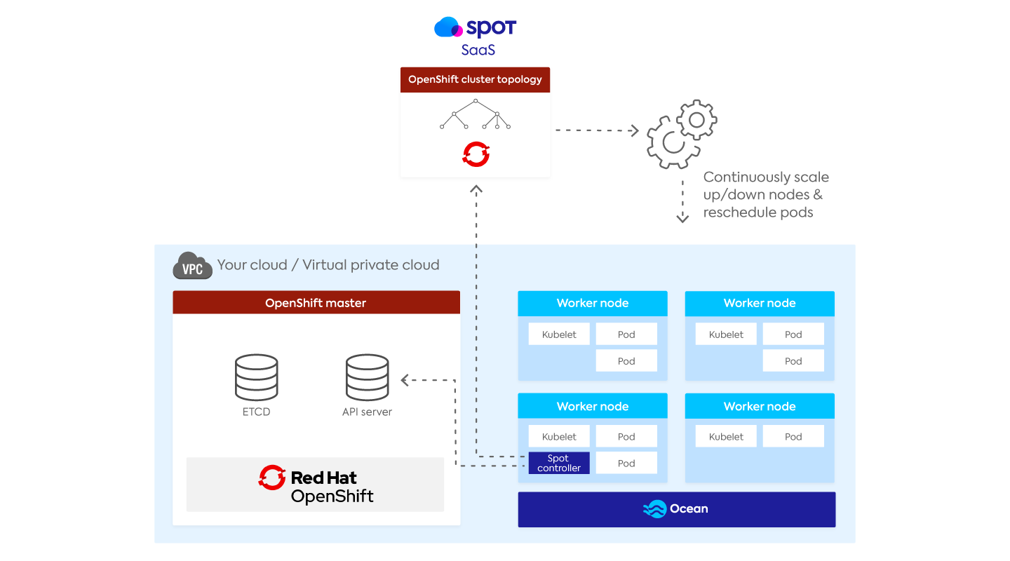 利用海洋的地方,用户可以完全管理数据飞机服务运行豆荚和容器没有必须处理维护的负担,缩放和底层工人节点基础设施生命周期。海洋确定最优混合OpenShift实例类型和大小的实时工作节点,基于部署/豆荚的要求。海洋在需要的时候重新安排豆荚,成本和性能优化