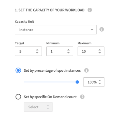 在这里,您可以选择实例或vcpu和期望目标,最小值和最大值分别.如果你愿意总是使用按需实例运行部分工作负载,您可以定义特定数量的实例,也可以设置按需实例与现货实例的百分比.