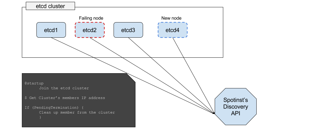 Etcd指望实例在终止之前把自己从一个集群。因为我们正在与现货情况下有必要添加一些额外的逻辑使方案更加健壮,以便现场实例可以更换没有问题。