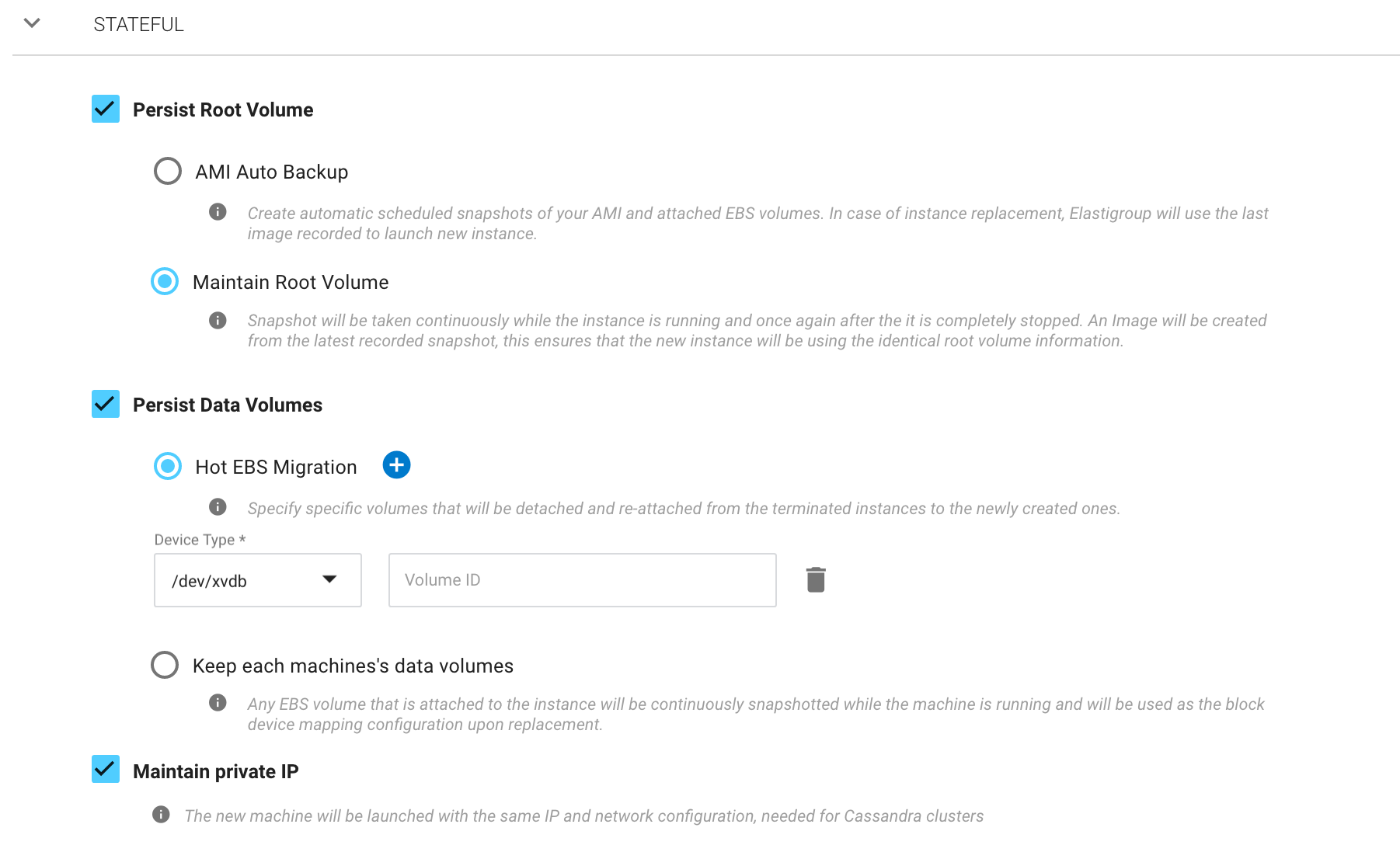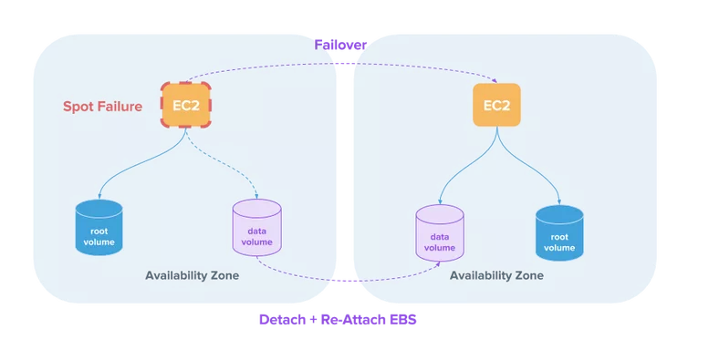 作为状态特征的一部分,Elastigroup允许保留机器的数据量,任何EBS卷附加到实例将连续快照在机器运行时,将使用的块设备映射配置替换。
