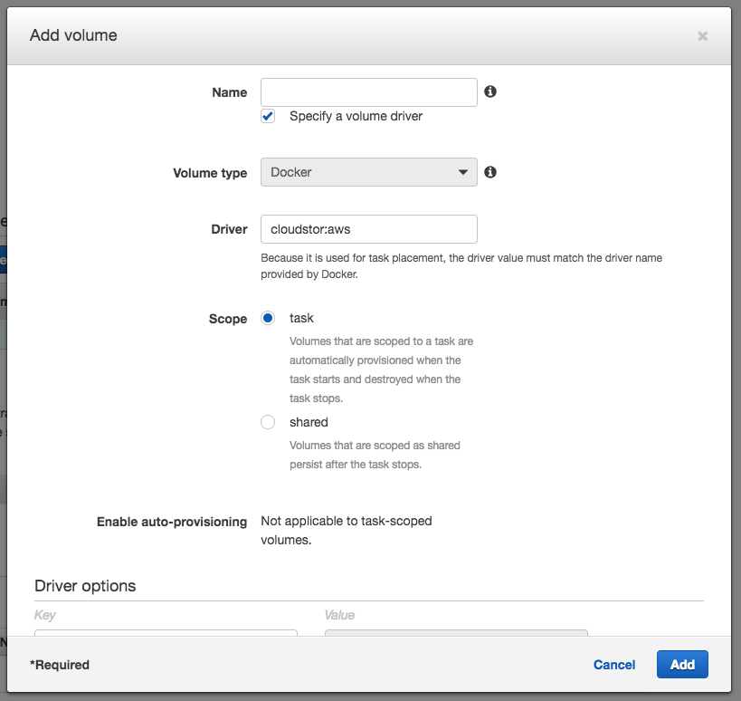 - 驱动程序设置为所需的码头工人卷插件。在这种情况下,“cloudstor: aws”