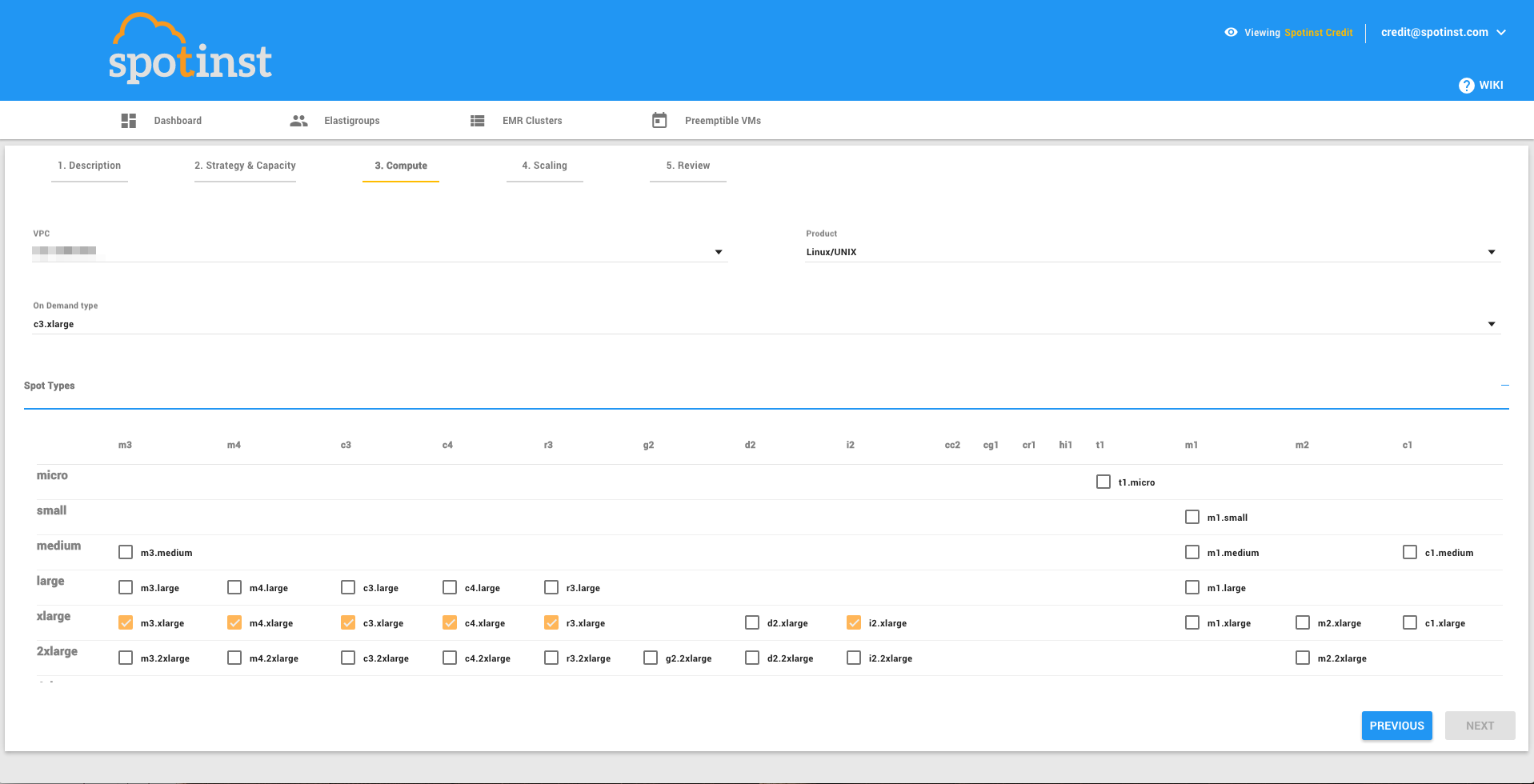 在你Spotinst控制台:定义Elastigroup相关,(如大型实例类型。c3.8xlarge,r3.8xlarge等),类型,越多越好。——定义你想要的阿兹和再一次,人越多,越好玩。