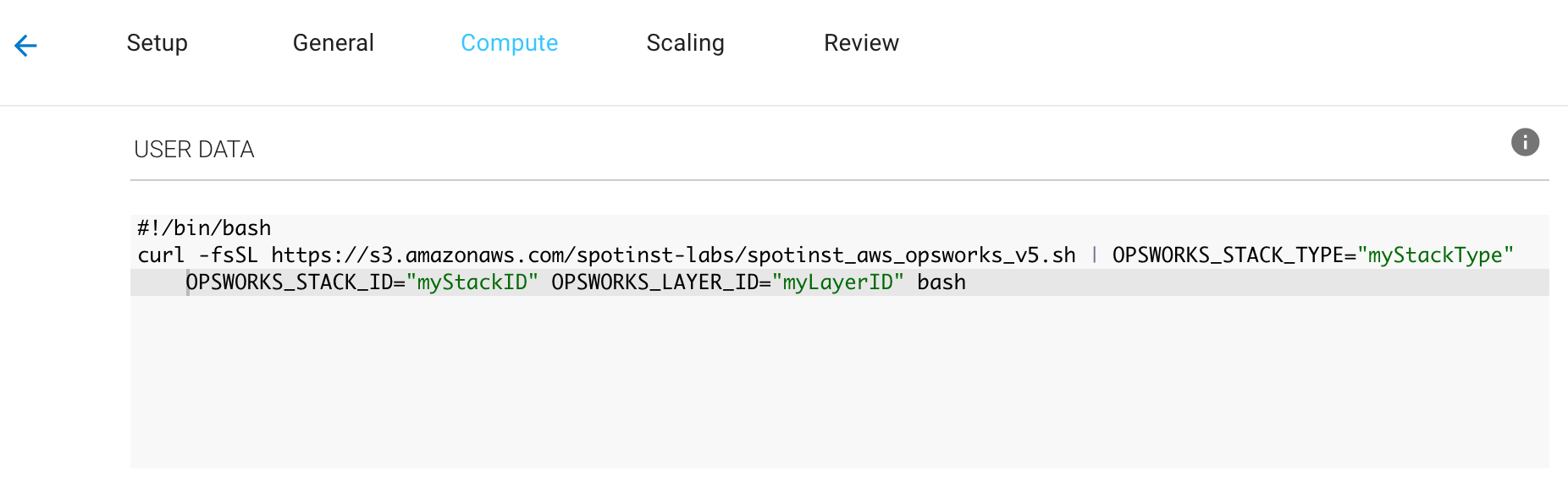 一旦您已经配置了我的角色,您的实例可以执行操作和附着于任何OpsWorks堆栈。创建一个Elastigroup,从上一步选择我的角色并设置用户数据(启动脚本)与以下命令来注册您的实例所需的堆栈。