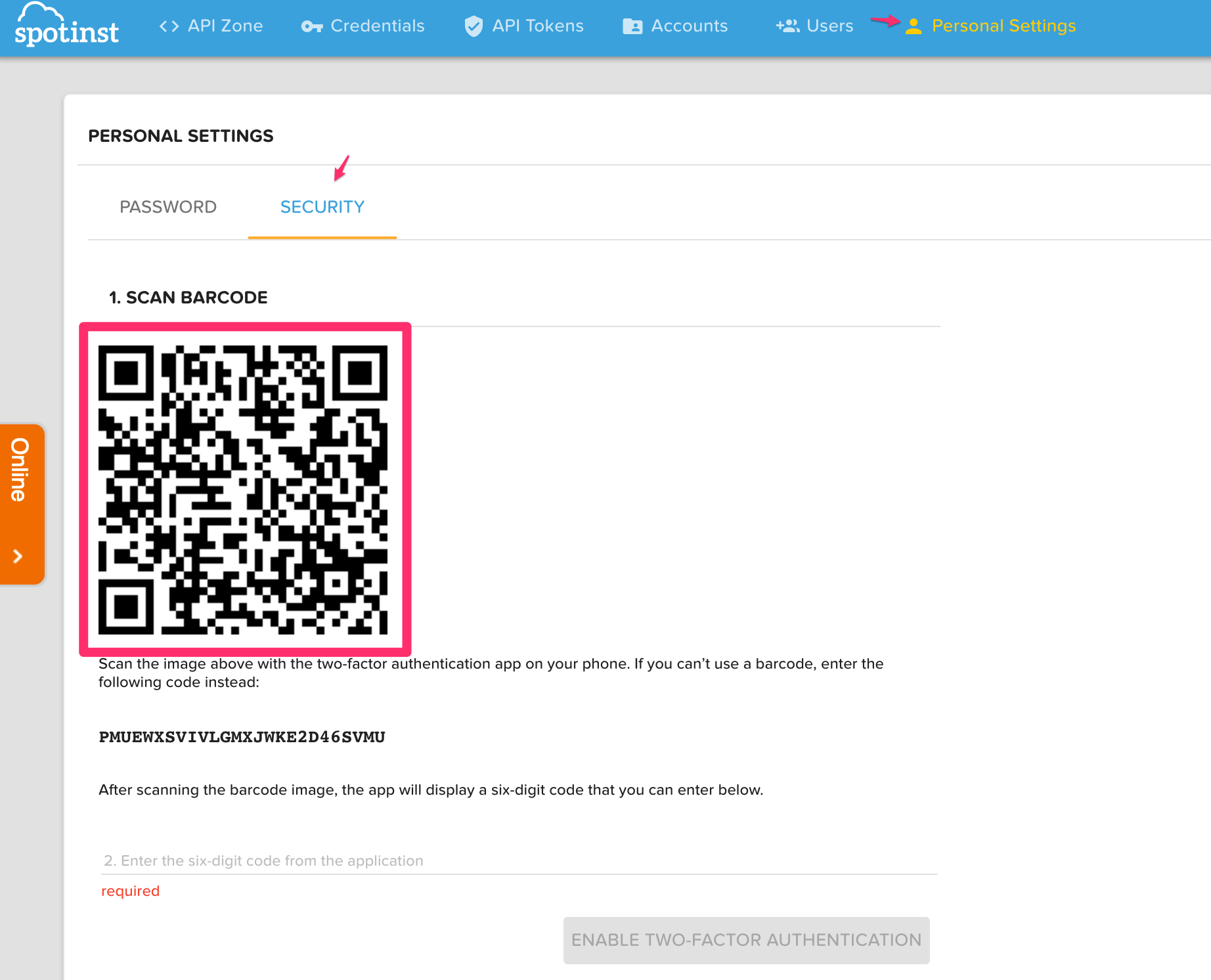 扫描条形码到你”谷歌身份验证”,输入6位代码从应用程序到高亮显示的文本框。