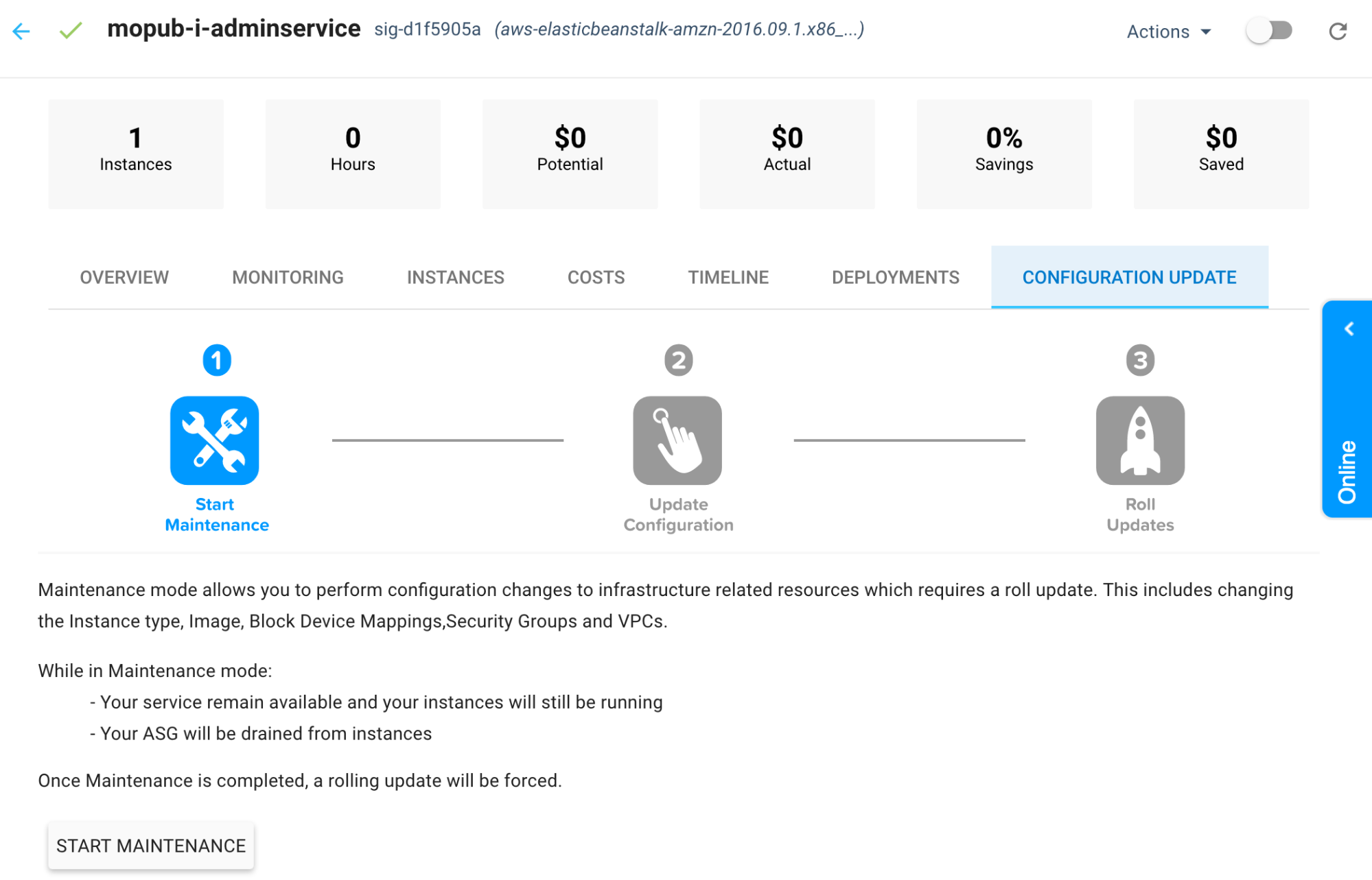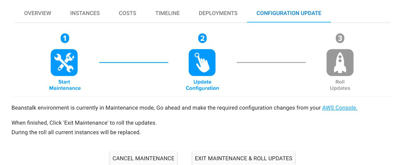 维护模式允许您执行基础设施的配置更改相关资源需要滚动更新。雷竞技rabet官网这包括实例类型变化、图像、块设备映射、安全组和vpc。