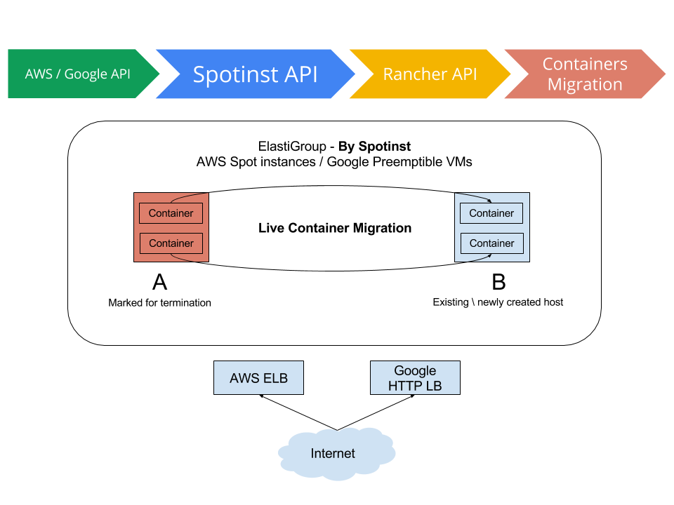 例如,如果Spotinst标识,现场实例上运行的容器是,即将终止(4 -交汇处提醒),Spotinst会指示牧场主暂停,容器和搬迁到另一个相关的实例。