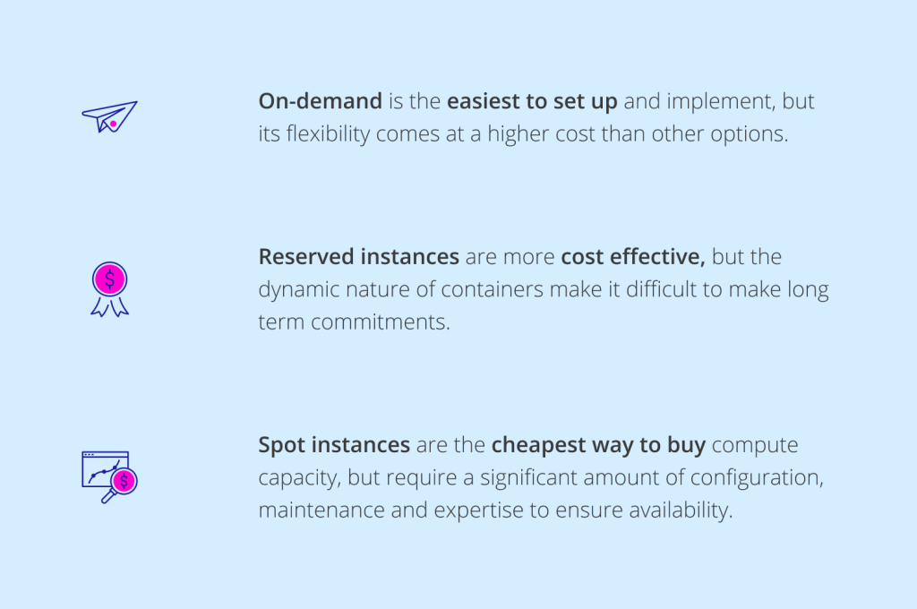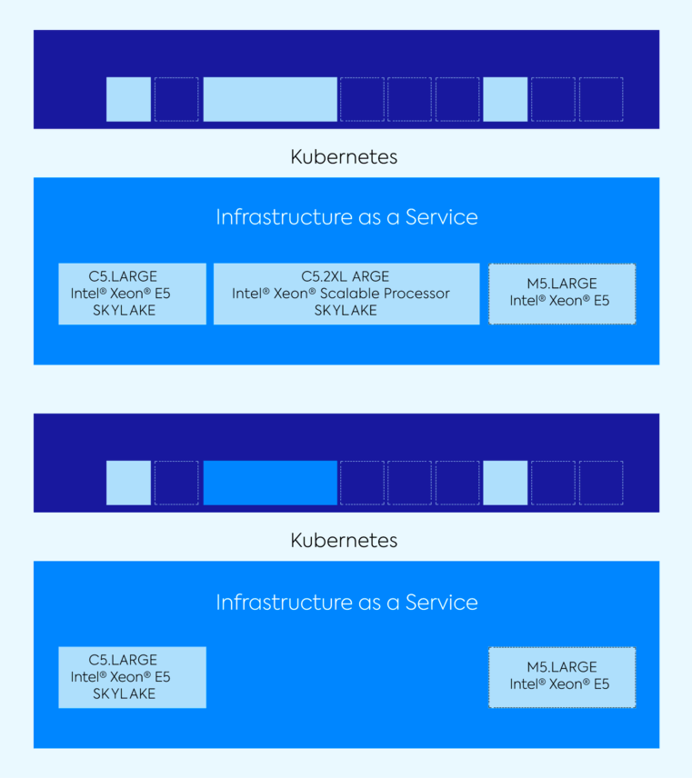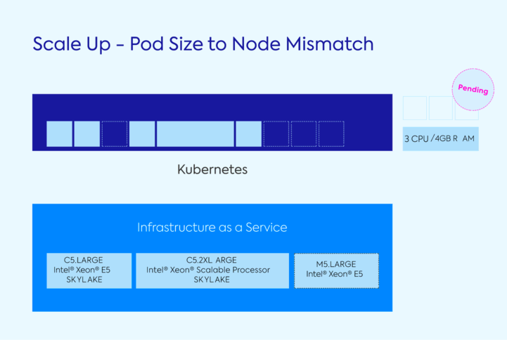在这种情况下,最好是带走C5。大或M5。大,而不是C5.XLarge。pods那些较小的情况下可以重新在另一个节点,和集群仍然有效,只运行在它所需要的,与所有的豆荚。这些豆荚和节点之间的不匹配会妨碍Kubernetes”固有的灵活性。在最大效率、基础设施应该受益于相同的扩展灵活性容器。