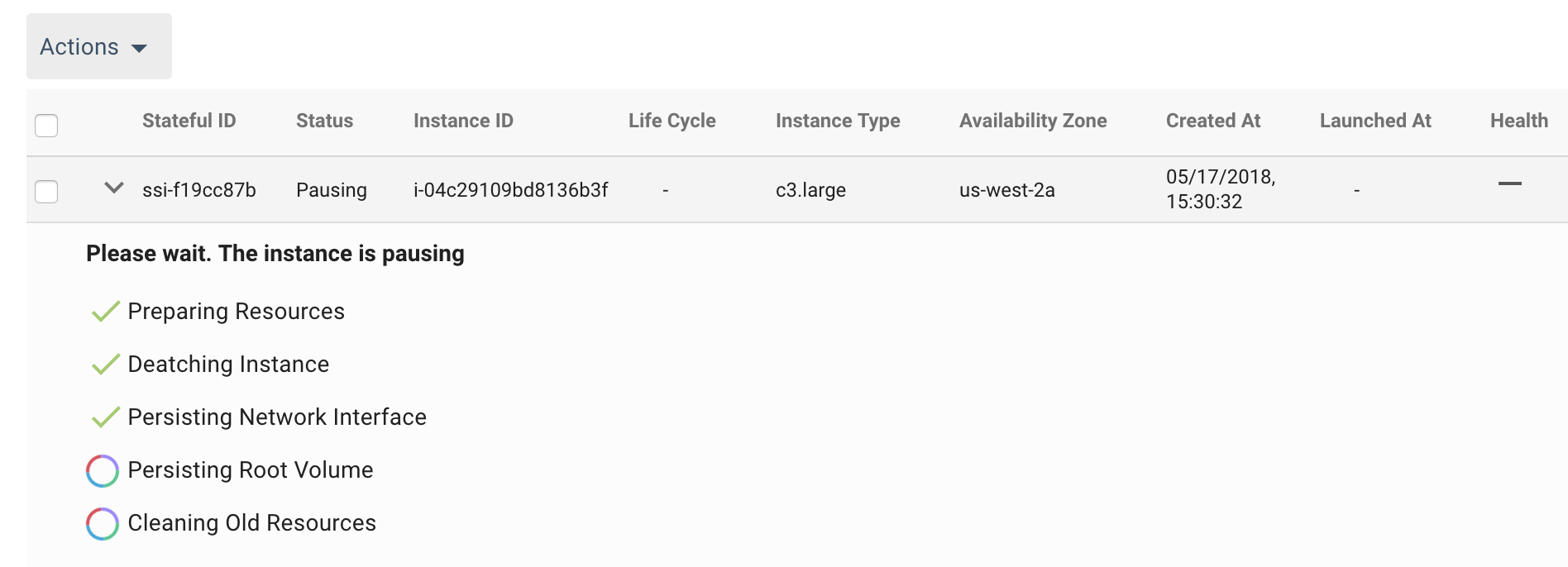 现在,随着新的详细行动视图中,您可以学习你的有状态的实例的状态。直接导航到集团的实例表和扩大实例行查看所有内部行为发生,及其状态(在进步,成功或失败):