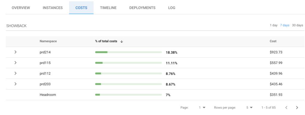 计算实际成本,Elastigroup首先计算集群的计算总成本,其中包括所有的Elastigroups连接到同一个Spotinst控制器。然后每舱计算相对资源分配,例如,如果你的豆荚请求1个vCPU和1镶条内存的共有20个vCPU和20直布罗陀海峡的RAM,这个舱分配5%的可用资源。雷竞技rabet官网最后,Elastigroup骨料pods分配资源为每个部署和名称空间,然后乘以计算总成本。雷竞技rabet官网