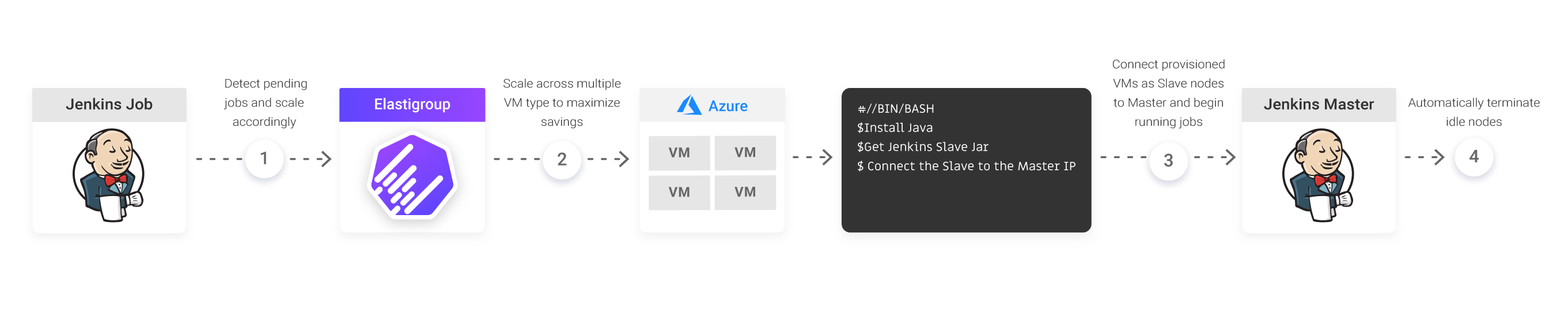 Spotinst詹金斯插件(1)检测到排队的岗位数量和尺度低优先级虚拟机相应的节点。(2)节点是跨多个VM配置类型和地区优化储蓄在保证可用性。(3)提供节点运行启动脚本作为詹金斯奴隶节点连接到詹金斯的主人,并立即开始运行工作。(4)自动检测并终止空闲节点。