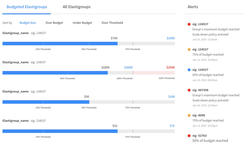 Elastigroup预算让你跟随你的云计算费用每个工作负载的实时和接收通知(邮件\ SNS)的情况下预算偏差,基于系统中您可以定义几个阈值。