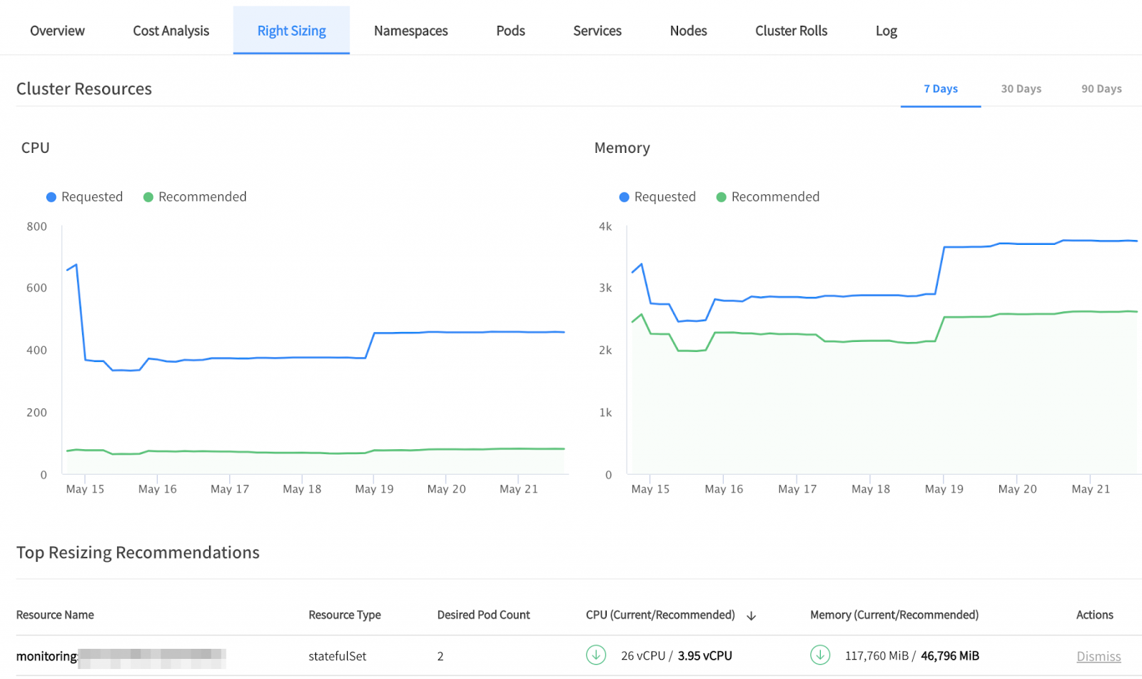 海洋不断监控Kubernetes工作负载的CPU和内存使用情况,提供分级建议部署基于工作负载之间的增量的请求和利用率。