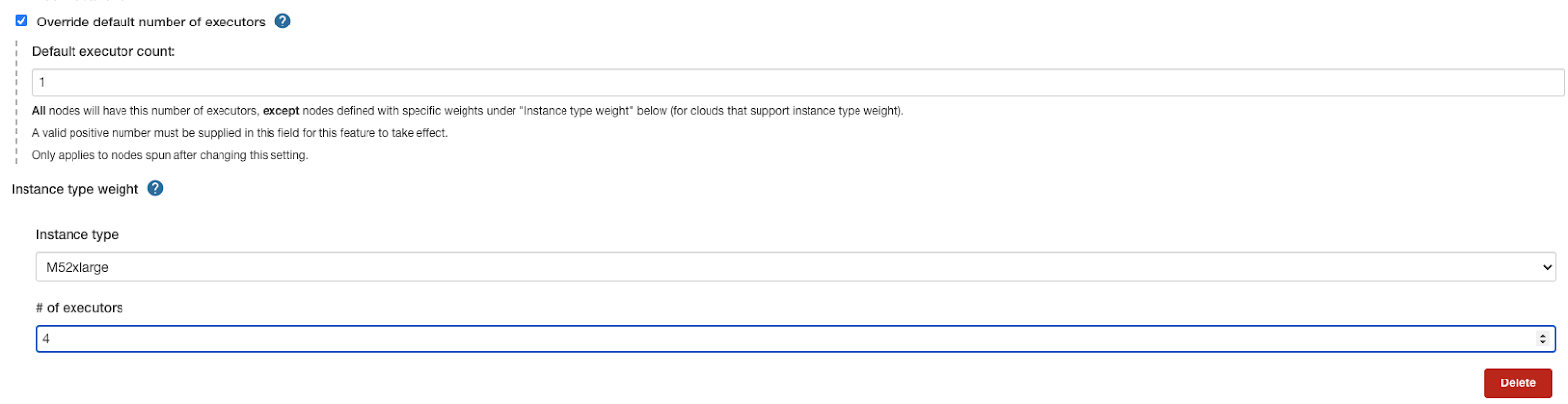 最新的除了现货詹金斯插件允许用户选择默认值更改为所需的遗嘱执行人数为一个特定的实例类型,或对所有实例类型。用户可以配置此设置一次,它是自动应用在詹金斯节点。在引入新节点类型时,由云提供商,遗嘱执行人定义计数也自动应用而不是詹金斯的违约。有了这个新功能,用户不再需要手动配置这些设置为每个实例类型。