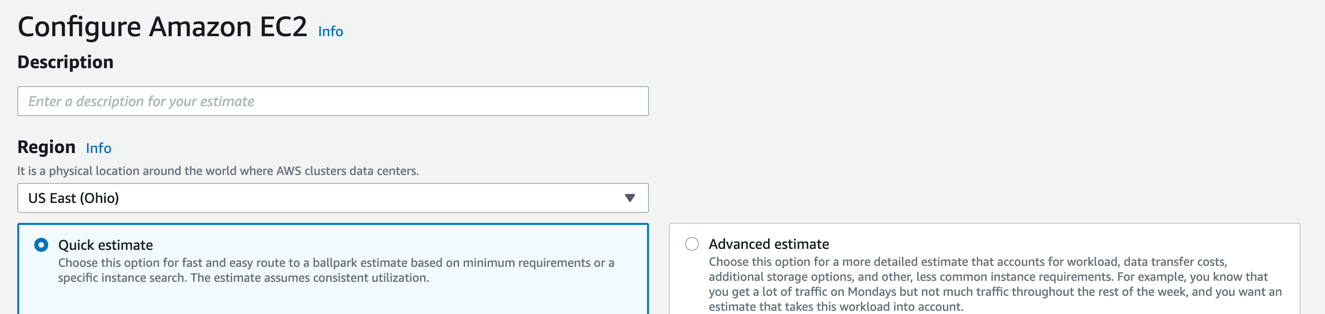 快速估计给你一个大概的价格以最小的配置信息。这可以给你一个大概的数字你的成本,即使你还没有确定你将如何EC2上运行的工作负载。