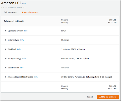 快速估算可以用最少的配置信息为您提供大致的价格。这可以为您提供成本的大概数字,即使您还不确定如何在EC2上运行工作负载。