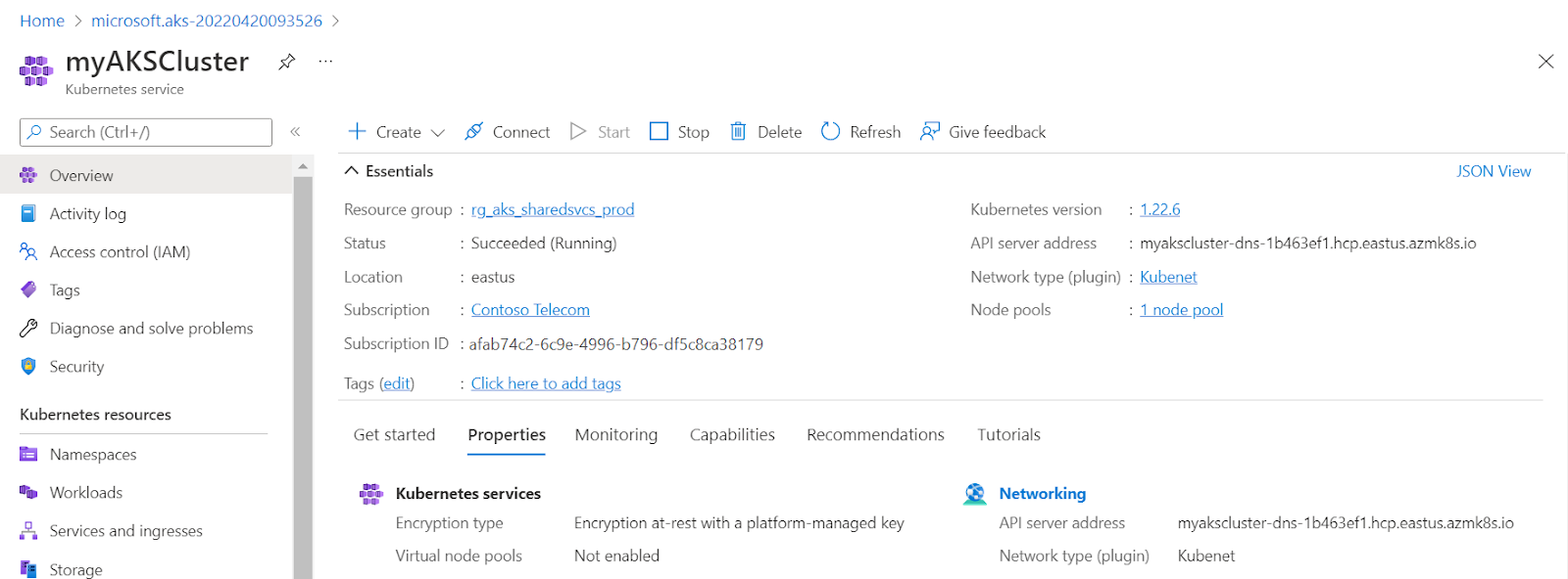 - 导航到部部集群资源组,选择资源。在这个例子中,搜索myResourceGroup myAKSCluster,选择资源。