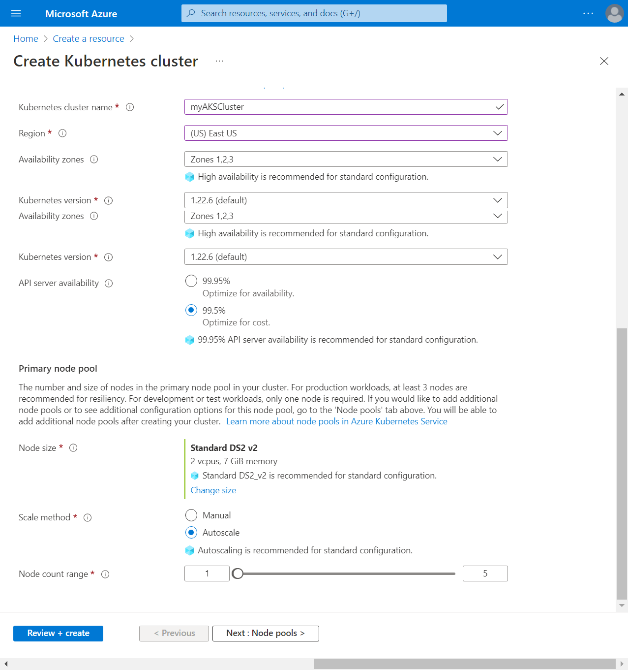 - 保持默认的节点池设置并点击下一个:访问在屏幕的底部。