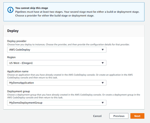 - 在步骤4下,部署提供者中,选择AWS CodeDeploy,并选择前面创建的应用程序。下部署组,选择唯一可用的部署组,然后单击下一个。