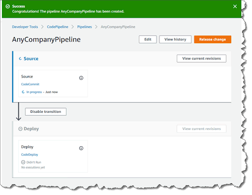 这些指令从AWS CodePipeline缩写官方教程。本教程展示了如何使用CodePipeline代码更改部署到一个Amazon EC2实例。它显示了如何创建一个亚马逊CodeCommit库来存储您的代码,并使用CodeDeploy部署更改。