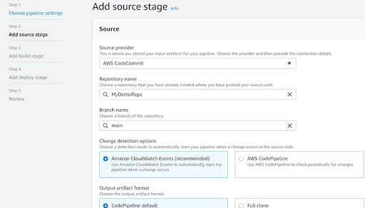 图片来源:AWS - 在步骤5,检查您所选择的选项并单击创建管道。